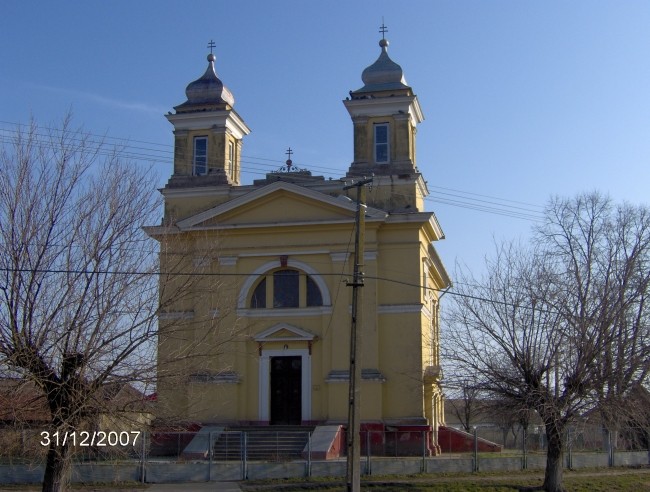 Primul document vechi atestat despre localitatea Foeni dateaza din anul 1289. Despre biserica ca atare avem dovezi abia din anul 1660, cand intr-un inscris vechi se pomeneste numele preotului Stoian. Pe locul unde este situata in ziua de azi piramida cu cruce, ridicata din piatra, se afla vechea biserica, care a fost comuna atat pentru localnici sarbi cat si pentru cei romani. Biserica veche a fost construita intre anii 1760 - 1770. De biserica este legat numele nobililor Mocioni, printre care cei mai importanti au fost: Andrei Mocioni, membru al Academiei romane din Bucuresti, Alexandru Mocioni, de profesie filosof. Amandoi erau in relatii stranse cu persoane de vaza din Serbia, in special cu Sfetozar Miletici, cunoscut om politic in acea vreme. Fiind strans legati de biserica au luptat cu inversunare pentru drepturile ortodocsilor romani de a se separa de pe langa Mitropolia din Krlovat, de care acestia din urma depindeau. Totodata, intr-un comunicat datat din anul 1868, se precizeaza ca in Foeni se aflau 598 etnici sarbi si 1619 romani, deci era de asteptat ca biserica comuna sa ramana la comunitatea cea mai numeroasa (majoritara). Acest lucru nu s-a intamplat, deoarece vechea biserica era intr-o stare critica, astfel romanii si-au ridicat lacasul in anul 1875 iar sarbii in anul 1887 cu ajutorul dat din partea Laurei Mocioni, sotia lui Andrei Mocioni, care a fost nepoata patriarhului Arsenie al III - lea Ciarnoievici. Ambele biserici si-au pastrat acelasi hram: Adormirea Maicii Domnului Sf. Marie, care se serbeaza pe data de 15 respectiv 28 august. Dupa stilul constructiei, biserica sarba are mai multe caracteristici: cladirea este impozanta, la subsol se afla cripta unde sunt inmormantati Laura si Andrei Mocioni. Deasupra naosului se ridica doua turnuri mari, iar iconostasul este lucrat manual si contine doua icoane importante: Maica Domnului si Isus Hristos. Mocionii se aflau printre cele mai cunoscute familii aristrocrate romanesti din acea vreme, avand meritul ca localitatea Foeni sa fie cunoscuta si peste hotare si de catre persoane importante. Printre ele se afla si printul Alexandru, fiul lui Karadjordje, cneazul Serbiei. Alexandru a daruit bisericii sarbe un clopot, avand greutatea de 103 kg si o cruce mare. Pe langa acest clopot, in biserica se aflau inca doua clopote si multe carti valoroase care s-au pastrat de-a lungul timpului.