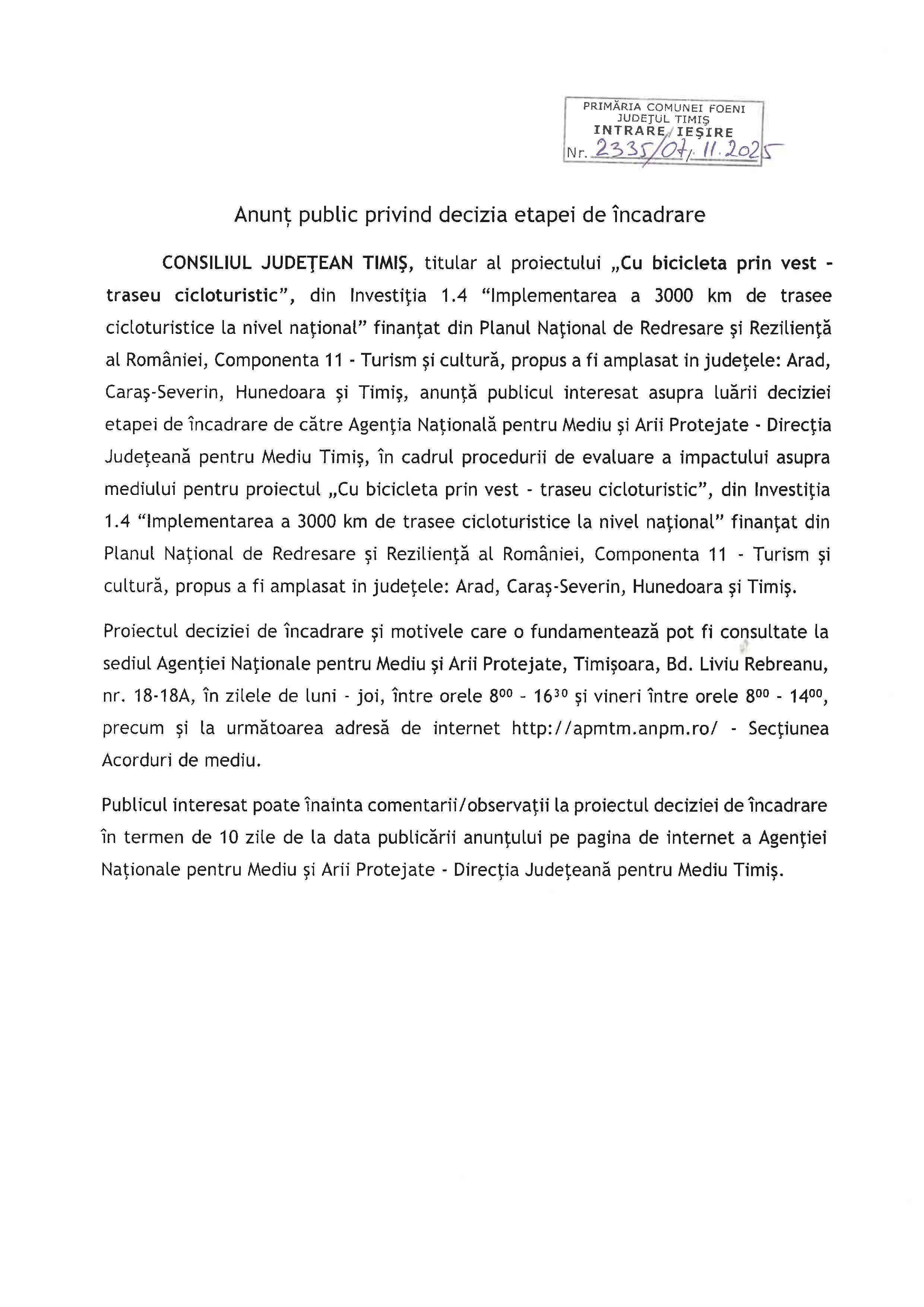 Anunt Public privind decizia etapei de incadrare proiect ”Cu bicicleta prin vest - traseu cicloturistic”