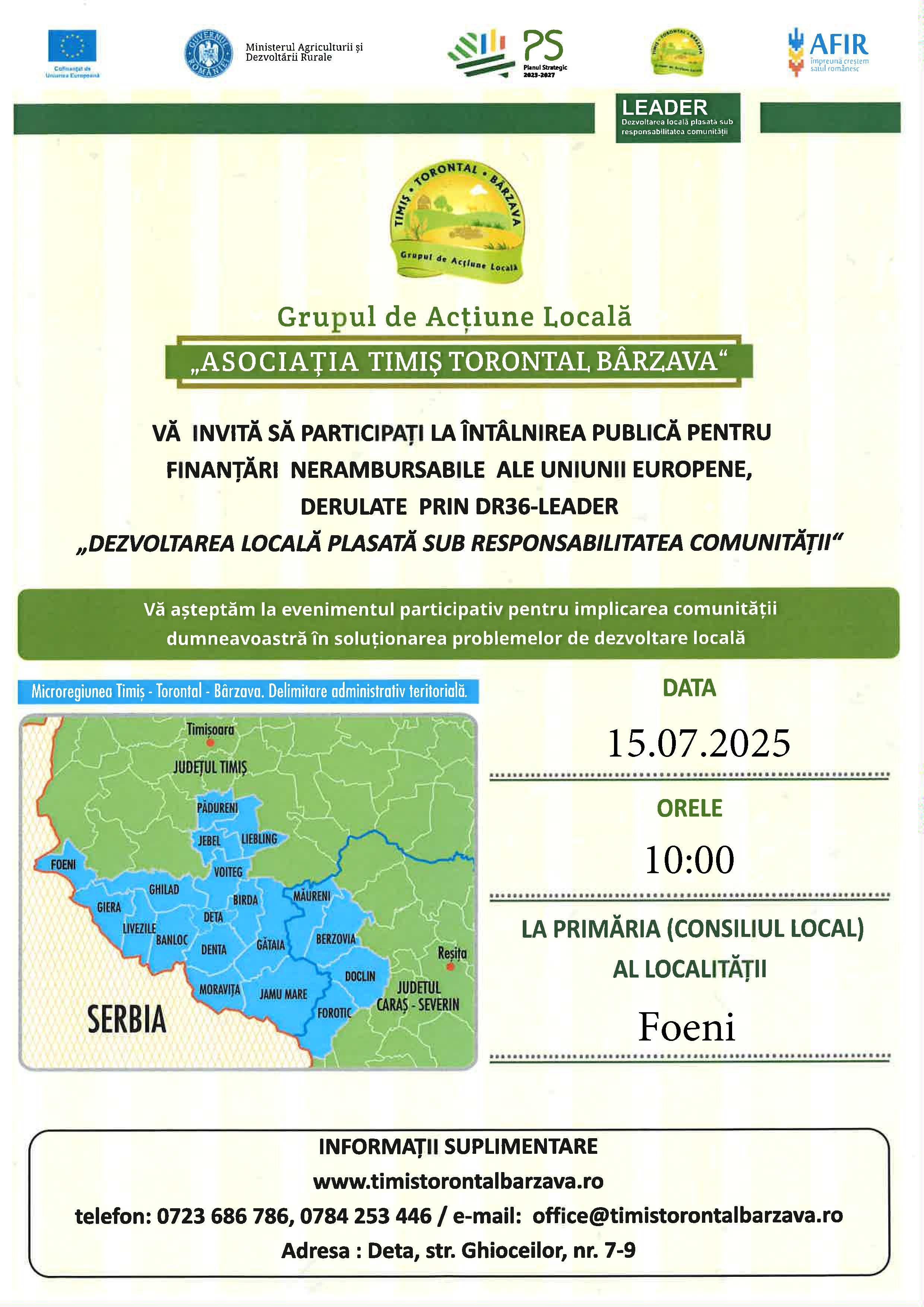 Asociatia Timis Torontal Barzavava invita sa participati la intalnirea publica pentru finantari nerambursabile ale Uniunii Europene, derulate prin DR36-Leader ”Dezvoltare locala plasata sub responsabilitatea comunitatii”